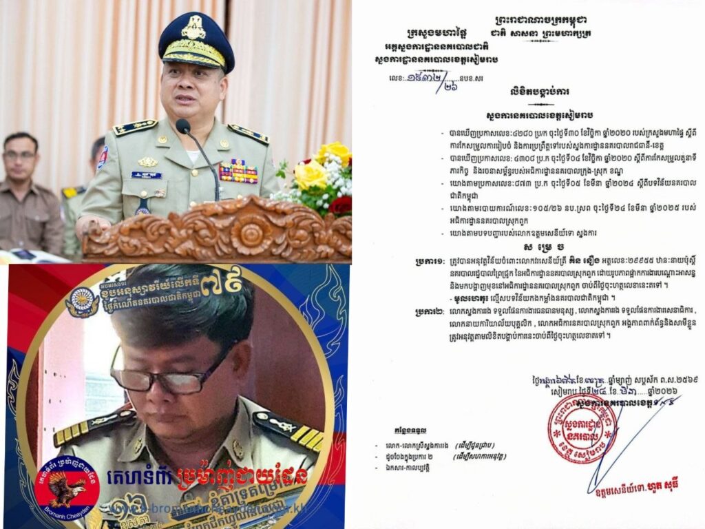 ​ខេត្តសៀមរាប÷លោកឧត្តមសេនីយ៍ទោ ហួត សុធី ស្នងការនៃស្នងការដ្ឋាននគរបាលខេត្តសៀមរាប បានសម្រេចចេញដីកាផ្អាកការងារបណ្តោះអាសន្នចំពោះ លោកវរសេនីយ៍ត្រី គិន លឿង នាយប៉ុស្តិ៍នគរបាលរដ្ឋបាលព្រៃជ្រូក នៃអធិការដ្ឋាននគរបាលស្រុកពួក នៅថ្ងៃទី២៤ ខែមីនា ឆ្នាំ២០២៦ នេះ បន្ទាប់ពីផ្ទុះការរិះគន់យ៉ាងខ្លាំងជុំវិញករណីដោះលែងមេល្បែង។​យោងតាមលិខិតលេខ ១៩៣២/២៦ នបខ.សរ ការសម្រេចអនុវត្តវិន័យនេះ ធ្វើឡើងក្នុងមូលហេតុ ល្មើសបទវិន័យកងកម្លាំងនគរបាលជាតិកម្ពុជា។ លោកវរសេនីយ៍ត្រី គិន លឿង ត្រូវបានតម្រូវឱ្យមកបង្ហាញមុខនៅអធិការដ្ឋាននគរបាលស្រុកពួកជារៀងរាល់ថ្ងៃ ដើម្បីរង់ចាំការសម្រេចជាថ្មី។​ការដកបញ្ឈរជើងមន្ត្រីជាន់ខ្ពស់រូបនេះ បានកើតឡើងក្រោយពេលមានការផ្សព្វផ្សាយព្រោងព្រាតថា បុគ្គលឈ្មោះ បង សៀង ដែលគេស្គាល់ថាជាមេល្បែងអាប៉ោងដ៏ល្បីក្នុងតំបន់ ត្រូវបានសមត្ថកិច្ចស្រុកពួកបង្ក្រាប និងឃាត់ខ្លួនរួមជាមួយបក្សពួកសរុប ៧ នាក់ រួចប្រគល់ឱ្យប៉ុស្តិ៍រដ្ឋបាលព្រៃជ្រូកជាអ្នកចាត់ការបន្ត។ ក៏ប៉ុន្តែ អ្វីដែលបង្កឱ្យមានការភ្ញាក់ផ្អើលនោះ គឺមេល្បែងរូបនេះ បែរជាអាចគេចខ្លួនបាត់ដោយសុវត្ថិភាព ដែលនាំឱ្យមានការសង្ស័យថា Read more