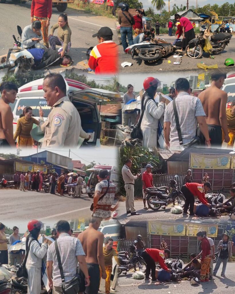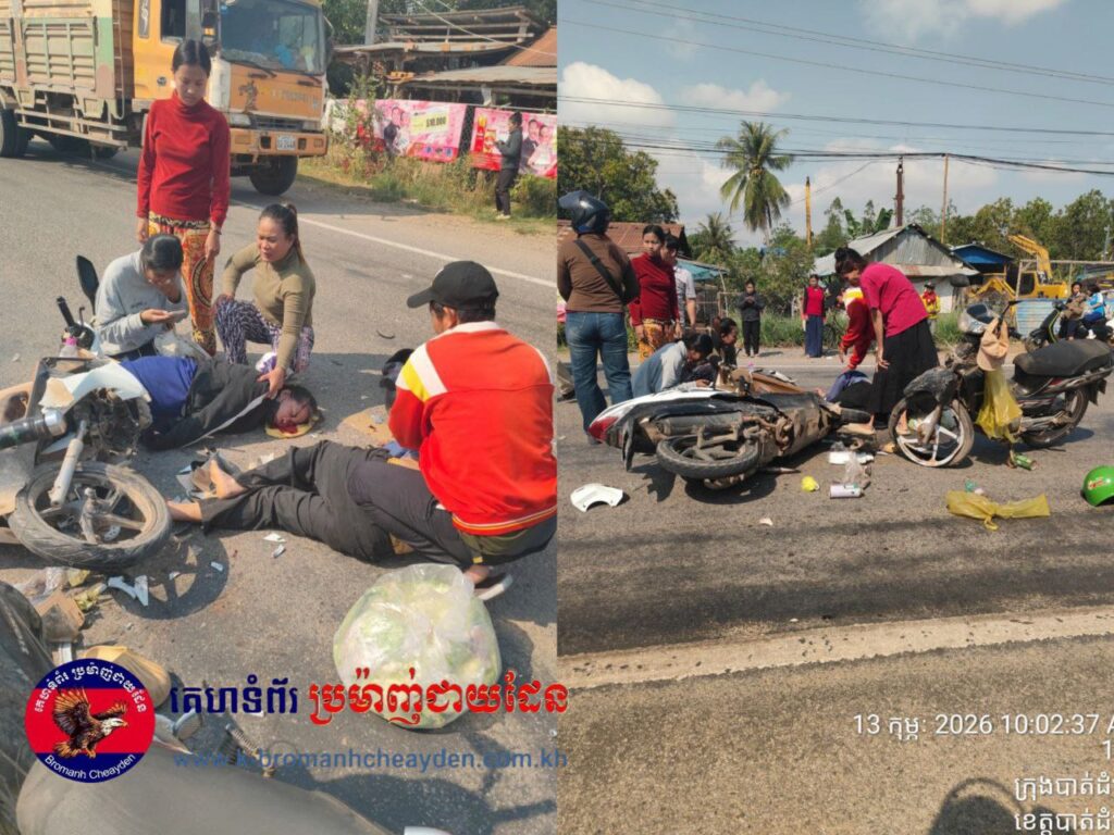 ក្រុងបាត់ដំបង៖ គ្រោះថ្នាក់ចរាចរណ៍ដ៏រន្ធត់មួយបានកើតឡើងរវាងម៉ូតូ និងម៉ូតូ ក្នុងទិសដៅស្របគ្នា បណ្ដាលឱ្យបុរសម្នាក់ និងស្ត្រីម្នាក់រងរបួសធ្ងន់ កាលពីវេលាម៉ោង ១០:០០ ព្រឹក ថ្ងៃទី១៣ ខែកុម្ភៈ ឆ្នាំ២០២៦ នៅចំណុចមុខសាលាឃុំវត្តគរ ក្រុងបាត់ដំបង ខេត្តបាត់ដំបង។