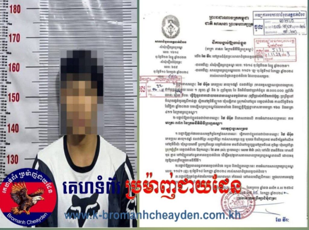បាត់ដំបង៖ នៅថ្ងៃទី០៧ ខែកញ្ញា ឆ្នាំ២០២៥ វេលាម៉ោង២២:៣០នាទី នៅចំណុចភូមិអូរ ឃុំពេជ្រចិន្តា ស្រុកភ្នំព្រឹក ខេត្តបាត់ដំបង កម្លាំងជំនាញផ្នែកនគរបាលយុត្តិធម៌ រួមជាមួយកម្លាំងប៉ុស្តិ៍នគរបាលរដ្ឋបាលពេជ្រចិន្តា នៃអធិការដ្ឋាននគរបាលស្រុកភ្នំព្រឹក ដឹកនាំដោយលោកវរសេនីយ៍ទោ សំ វីរៈ អធិការនគរបាលស្រុកភ្នំព្រឹក បានចុះអនុវត្តដីកាបង្គាប់ឱ្យចាប់ខ្លួនលេខ ៩៩០ ចុះថ្ងៃទី៣០ ខែសីហា ឆ្នាំ២០២៤ របស់លោក ឆៃ វីវៈ ចៅក្រមជំនុំជម្រះ នៃសាលាដំបូងខេត្តបាត់ដំបង ដែលបង្គាប់ឲ្យចាប់ខ្លួន-ឃុំខ្លួន ពិរុទ្ធជនម្នាក់ឈ្មោះ ថៃ ចំរ៉ុង ភេទប្រុស អាយុ អាយុ១៧ឆ្នាំ មានទីលំនៅភូមិអូរ ឃុំពេជ្រចិន្តា ស្រុកភ្នំព្រឹក ខេត្តបាត់ដំបង ពីបទធ្វើឲ្យខូចខាតដោយចេតនាមានស្ថានទម្ងន់ទោស (ប្រើប្រាស់កាំបិតកាប់ម៉ូតូ) ប្រព្រឹត្តនៅចំណុចរង្វង់មូលស្រីកាន់ផ្កា ស្ថិតនៅភូមិគីឡូ១៣ ឃុំសន្តិភាព ស្រុកសំពៅលូន ខេត្តបាត់ដំបង កាលពីថ្ងៃទី២៦ ខែវិច្ឆិកា ឆ្នាំ២០២៣។