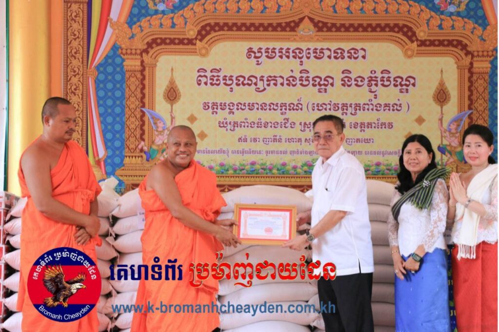 ក្នុងឱកាសនោះ ឯកឧត្តម អ៊ូ វណ្ណា និងលោកជំទាវ ព្រមទាំងក្រុមការងារ ក៏បាននាំបច្ច័យរបស់ឯកឧត្តមអភិសន្តិបណ្ឌិត និងលោកជំទាវ ចំនួន ៣១ ០៧០ ០០០រៀល(សាមសិបមួយលាន ប្រាំពីរម៉ឺនរៀល) អង្ករ ចំនួន ៥តោន មី ចំនួន ១០០កេស ទឹកបរិសុទ្ធ ចំនួន ១០០កេស និងទឹកក្រូច ចំនួន ១០០កេស ប្រគេនដល់ព្រះសង្ឃ សម្រាប់ចូលរួមកសាងហេដ្ឋារចនាសម្ព័ន្ធ និងផ្គត់ផ្គង់ចង្ហាន់ព្រះសង្ឃក្នុងវត្តត្រពាំងគល់ ផងដែរ៕