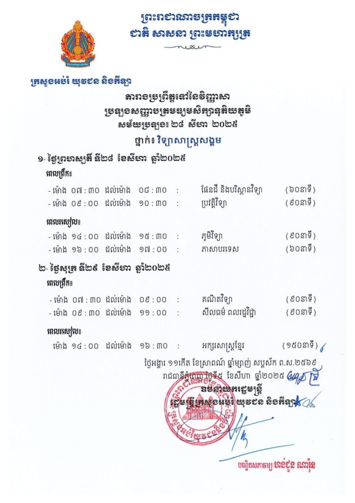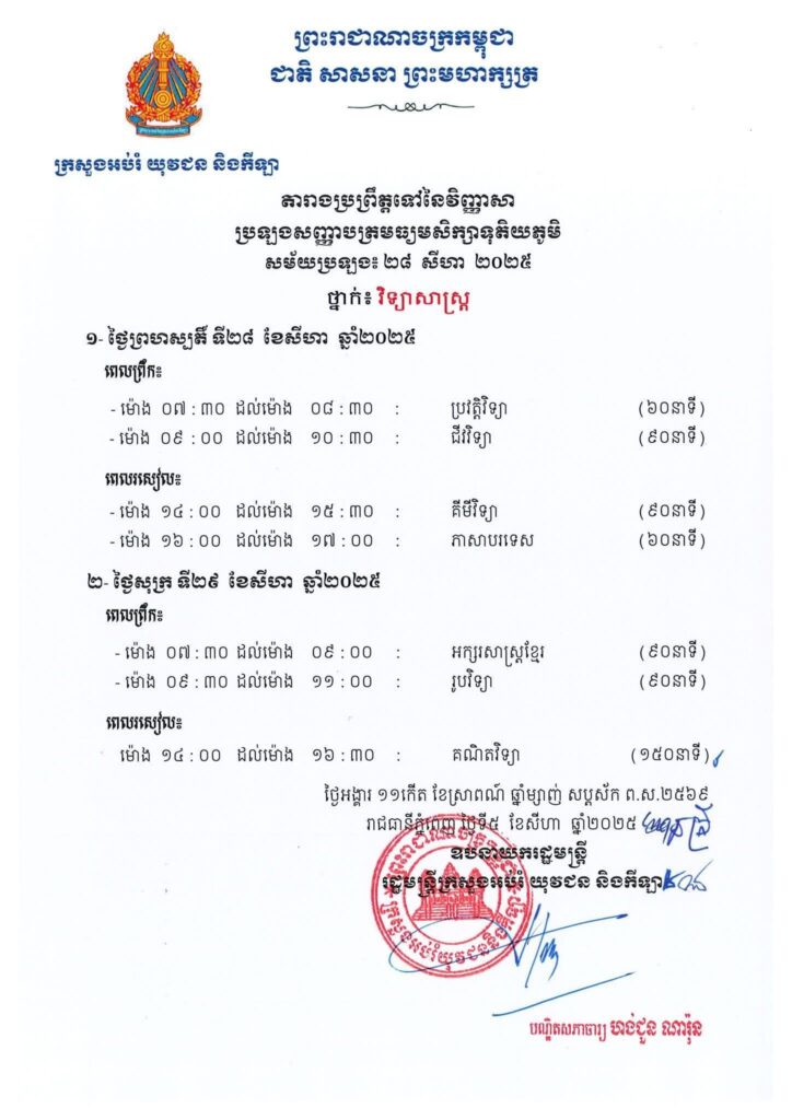 ក្រសួងអប់រំ យុវជន និងកីឡា ការរៀបចំប្រឡងសញ្ញាបត្រមធ្យមសិក្សាទុតិយភូមិ សម័យប្រឡង៖ ២៨ សីហា ២០២៥ ដោយមានកាលបរិច្ឆេទសំខាន់ៗដូចខាងក្រោម៖