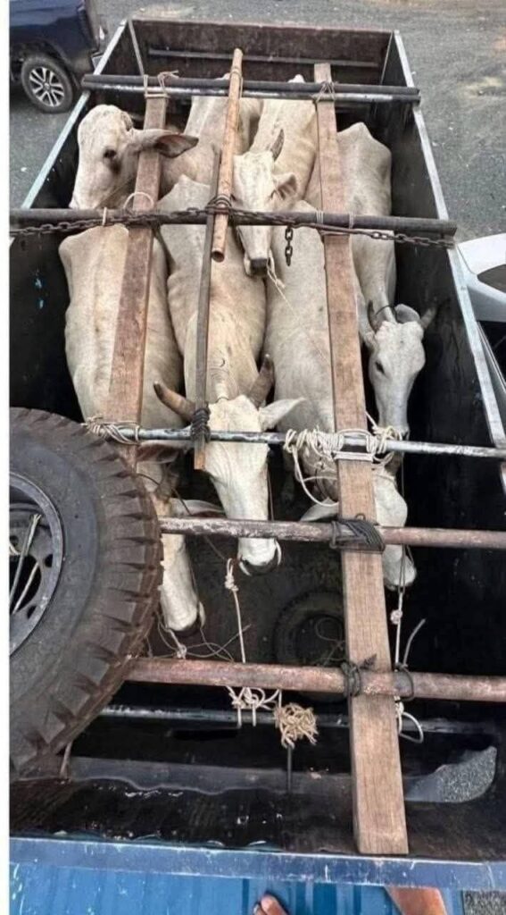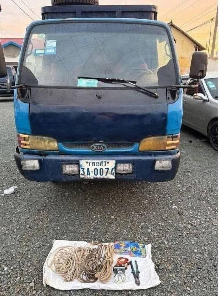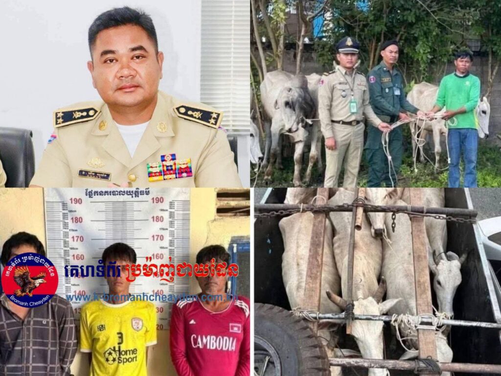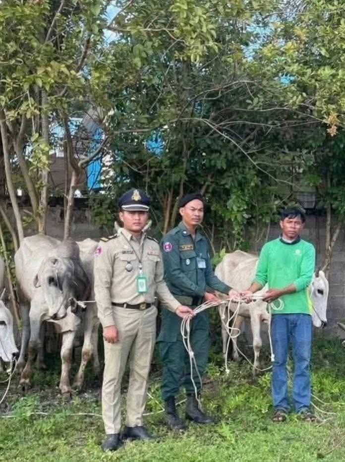 ដកហូតវត្ថុតាង: រថយន្តកូរ៉េពណ៌ខៀវ ទ្រង់ជិត ០១គ្រឿង ទូរស័ព្ទដៃ ០៥ គ្រឿង គោ ០៦ ក្បាល ដង្កាប់ ១ ខ្សែគោ ៤ ខ្សែរ ពិលកែវ ០១ -ធូបមូស ០២ ដុំ ។