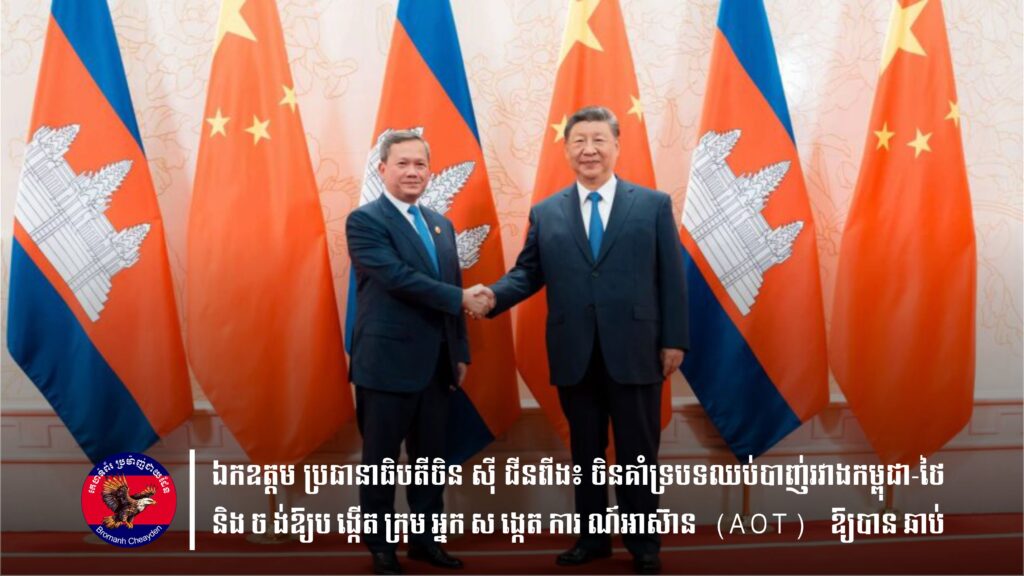 ក្នុងឱកាសនៃជំនួប ឯកឧត្តមប្រធានាធិបតី បានសម្តែងការស្វាគមន៍ប្រកបដោយមនោសញ្ចេតនាយ៉ាងជ្រាលជ្រៅបំផុត ជូនចំពោះ សម្តេចបវរធិបតី និងគណៈប្រតិភូរាជរដ្ឋាភិបាលកម្ពុជា ដែលបានឆ្លៀតឱកាសដ៏មមាញឹក អញ្ជើញចូលរួមកិច្ចប្រជុំកំពូលនៃអង្គការសហប្រតិបត្តិការសៀងហៃ បូក នៅសាធារណរដ្ឋប្រជាមានិតចិននាពេលនេះ។ ឯកឧត្តមប្រធានាធិបតីបានចាត់ទុកវត្តមានរបស់សម្តេចបវរធិបតី គឺជាកាលានុវត្តភាពដ៏សំខាន់ ដើម្បីបន្តរឹតចំណងមិត្តភាពដែកថែប និងពង្រីកសាមគ្គីភាព ចិន-កម្ពុជា ឱ្យកាន់តែរឹងមាំថែមទៀត បន្ទាប់ពីទស្សនកិច្ចផ្លូវរដ្ឋរបស់ឯកឧត្តម កាលពីខែមេសា កន្លងទៅ។ ពាក់ព័ន្ធនឹងស្ថានភាពនៅតាមព្រំដែនកម្ពុជា-ថៃ, ឯកឧត្តម ស៊ី ជីនពីង បានបញ្ជាក់ជាថ្មីពីជំហររបស់ចិនក្នុងការគាំទ្របទឈប់បាញ់, គាំទ្រយន្តការសង្កេតការណ៍បទឈប់បាញ់របស់អាស៊ានដែលដឹកនាំដោយម៉ាឡេស៊ី និងចង់ឱ្យបង្កើតក្រុមអ្នកសង្កេតការណ៍អាស៊ាន (AOT) ឱ្យបានឆាប់។ ទន្ទឹមនឹងនេះ ឯកឧត្តមប្រធានាធិបតីក៏បានគាំទ្រ និងផ្តល់ជំនួយមនុស្សធម៌ដល់កម្ពុជា ដើម្បីជួយស្តារឡើងវិញនូវការខូចខាត និងជួយសម្រួលដល់ទុក្ខលំបាករបស់ប្រជាពលរដ្ឋដែលរងគ្រោះពីការប៉ះទង្គិចប្រដាប់អាវុធកាលពីចុងខែកក្កដាកន្លងទៅ។