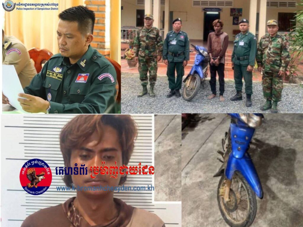 បានបង្ក្រាបករណី អំពើលួច (លួចម៉ូតូមកពីប្រទេសថៃ) ដែលបង្កឡើងដោយជនសង្ស័យឈ្មោះ គិន គឹមសិទ្ឋ ភេទប្រុស អាយុ ២៩ ឆ្នាំ ស្នាក់នៅភូមិគីឡូ១៣ ឃុំសន្តិភាព ស្រុកសំពៅលូន ខេត្តបាត់ដំបង (ឃាត់ខ្លួនបាន) បានក្រោយធ្វើសកម្មភាពលួចឆ្លងដែនចូលទៅក្នុងប្រទេសថៃ ផ្សារថៃ ភូមិខៅឌីន ស្រុកខ្លងហាត ខេត្តស្រះកែវ ប្រទេសថៃ បានលួចយកម៉ូតូ ចំនួន ០១ គ្រឿង ម៉ាក Suzuki Smash ពណ៌ទឹកប៉ិច-ខ្មៅ មានលេខតួ BE49R-TH204900 គ្មានស្លាកលេខ បណ្តើរលួចឆ្លងដែនចូលមកប្រទេសកម្ពុជាតាមច្រករបៀងជាប់ភូមិសាស្រ្ត ភូមិគីឡូ១៣ ឃុំសន្តិភាព ស្រុកសំពៅលូន ខេត្តបាត់ដំបង ក៏ត្រូវកម្លាំងសមត្ថកិច្ចសហការឃាត់តែម្តង ។