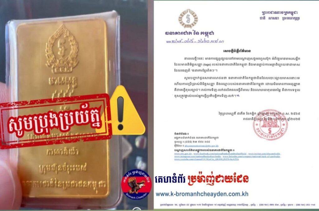 សូមបញ្ជាក់ជូនសាធារណជនថា ធនាគារជាតិនៃកម្ពុជាមិនដែលបោះផ្សាយមាសនោះទេ ហើយការប្រើប្រាស់និមិត្តសញ្ញា និងឈ្មោះរបស់ធនាគារជាតិនៃកម្ពុជា ដោយមិនមានការអនុញ្ញាត គឺជាទង្វើខុសច្បាប់។ រាល់ការទិញ-លក់ផលិតផលធ្វើពីមាស និងលោហធាតុមានតម្លៃ គឺជាការទទួល ខុសត្រូវផ្ទាល់របស់អ្នកធ្វើប្រតិបត្តិការទិញ-លក់៕
