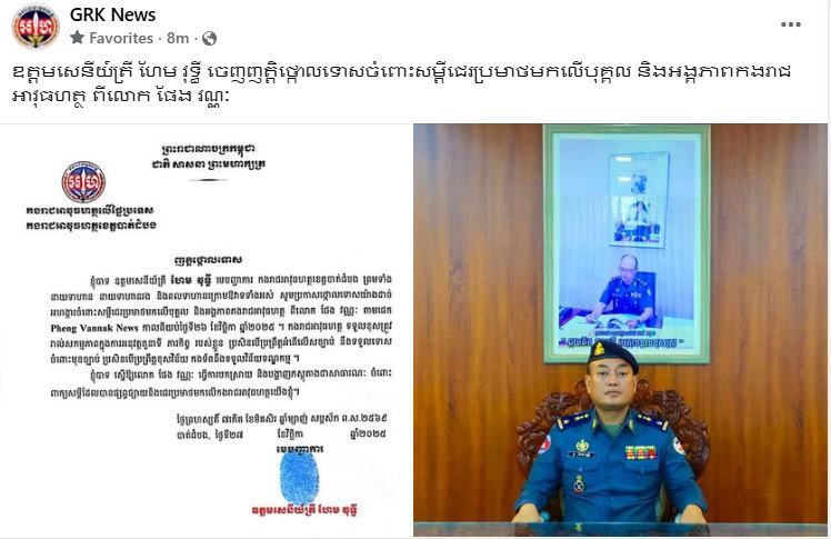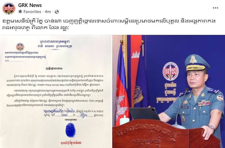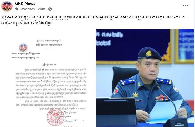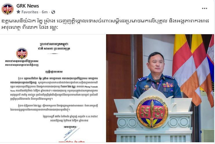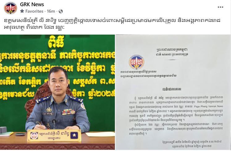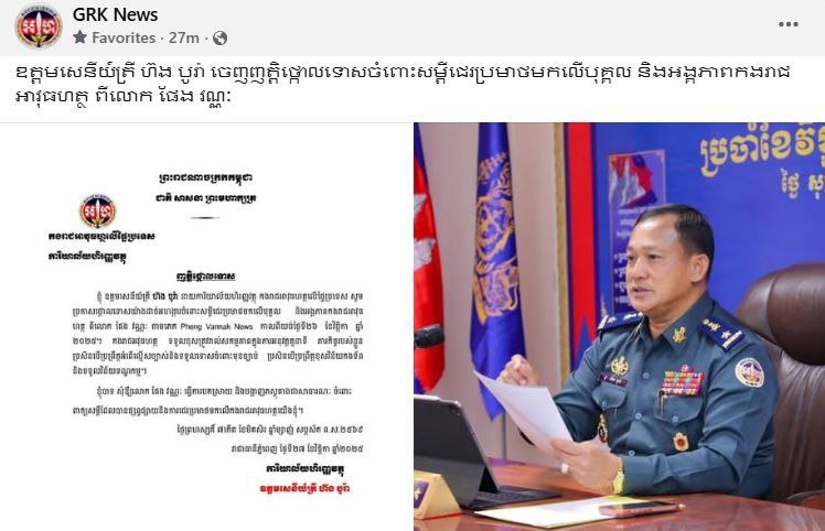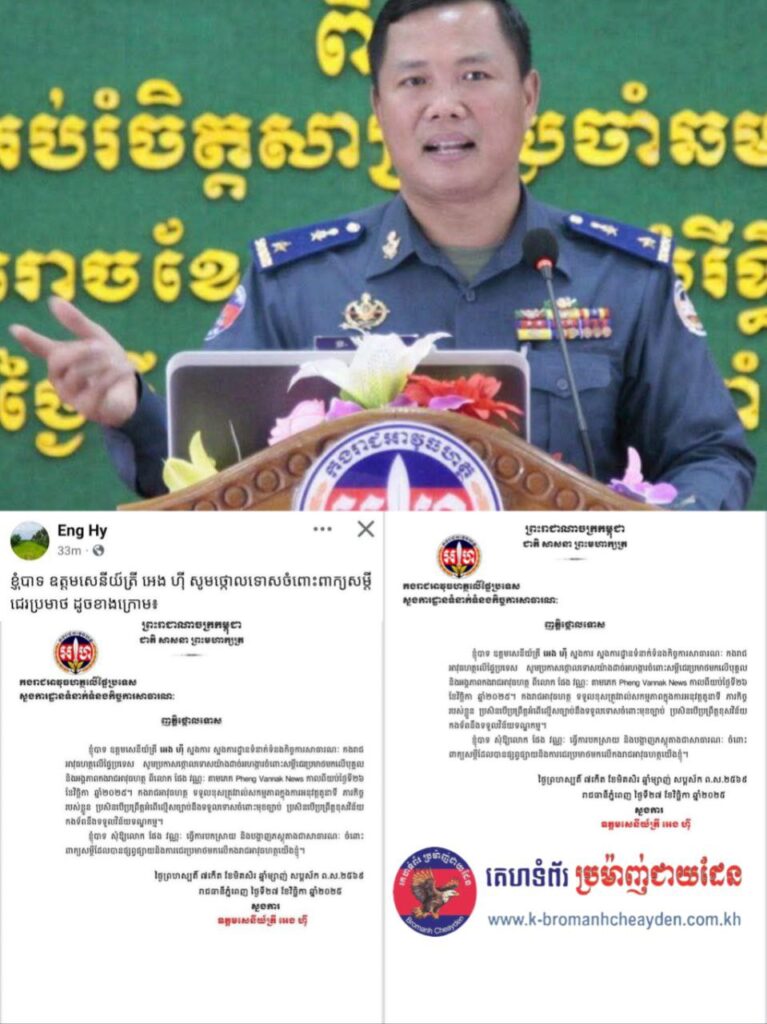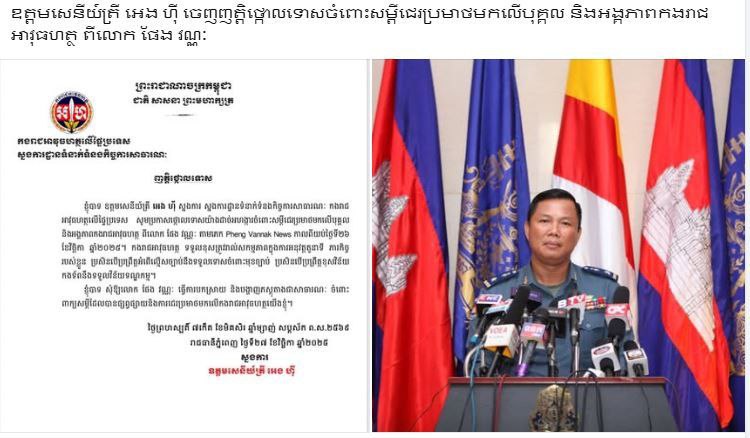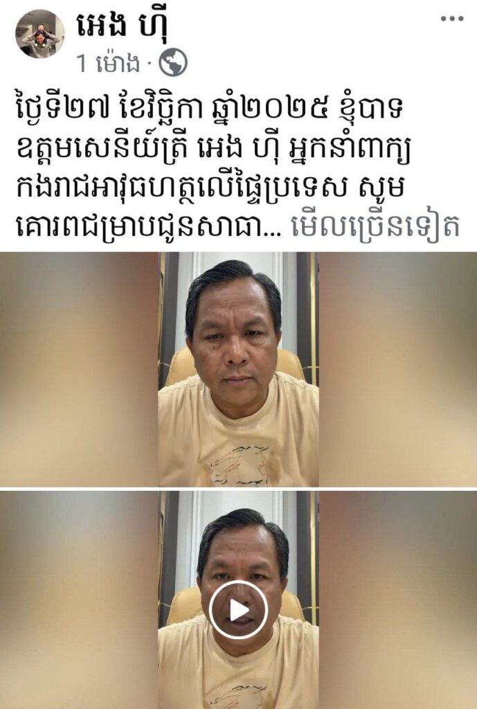 ថ្ងៃទី២៧ ខែវិច្ឆិកា ឆ្នាំ២០២៥ ខ្ញុំបាទ ឧត្តមសេនីយ៍ត្រី អេង ហ៊ី អ្នកនាំពាក្យកងរាជអាវុធហត្ថលើផ្ទៃប្រទេស សូមគោរពជម្រាបជូនសាធារណជន អ្នកសារព័ត៌មាន និងបុគ្គលពាក់ព័ន្ធដូចខាងក្រោម៖